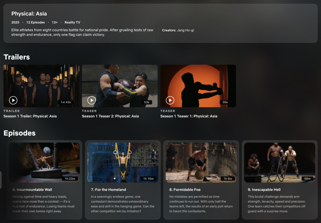 넷플릭스 피지컬 아시아는 국가 자존심 + 피지컬 드라마로 피지컬 100 시리즈의 새 지평! 한국 대표 응원하며 7~9회 방금 업로드 되었네요!!(9회 썸네일이 다음 퀘스트인데 호주 선수들이 올라갔군요 :)) 아직 안 보셨다면 지금 달려가세요 – 아시아 최강자들의 투혼이 기다려요.